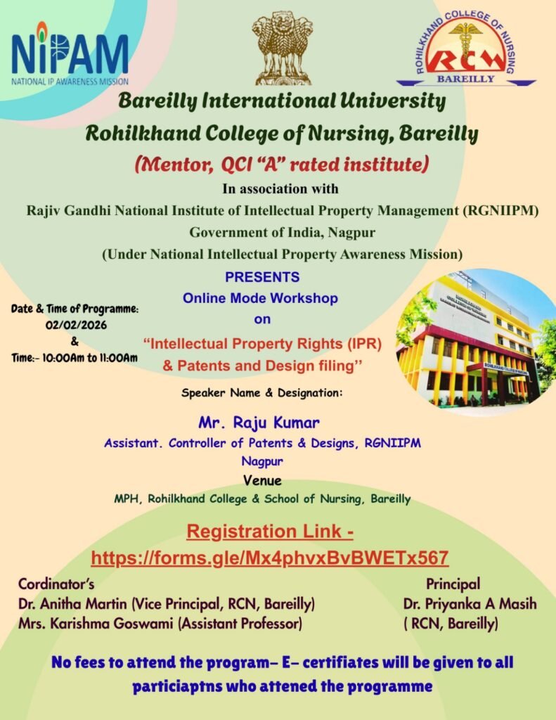 Rohilkhand College of Nursing, Bareilly constitute unit of Bareilly International University, Bareilly UP. Organized an online mode workshop on “Intellectual Property Rights (IPR) & Patent and Design Filing” in association with Rajiv Gandhi National Institute of Intellectual Property Management (RGNIIPM), Government of India, Nagpur on 2nd February 2026.