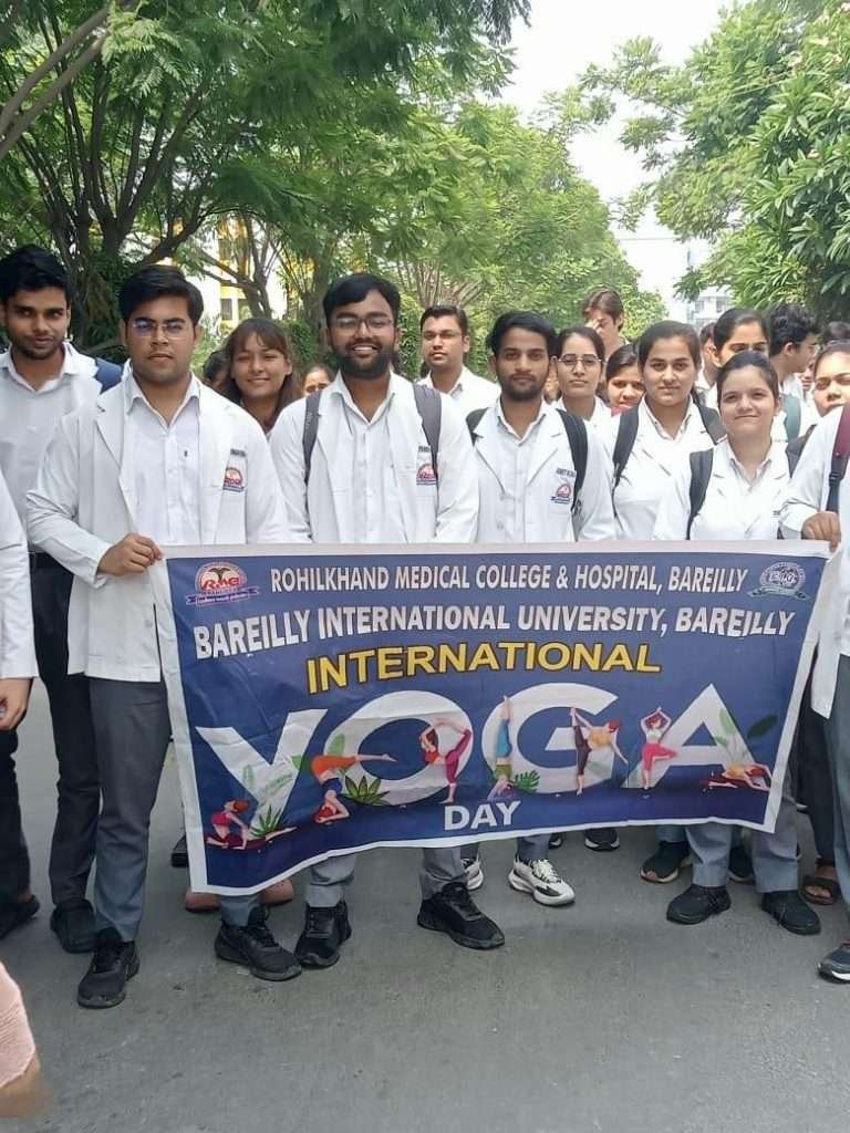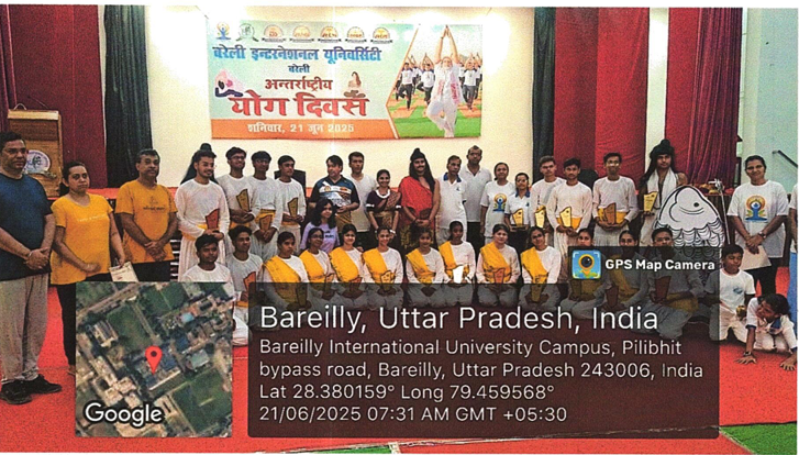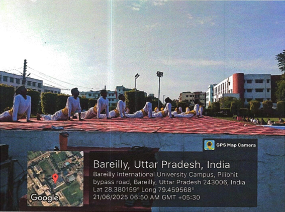 International Yoga Day was celebrated at Bareilly International University, Bareilly (U.P), on 21 June,2025, at Jhanda Ground. The Program commenced with a Yoga-themed Dance performance by the students of Medical, Dental, Nursing, Pharmacy and Paramedical College followed by a yoga session conducted under the supervision of Pro-Chancellor, Bareilly International University, Bareilly Dr. Ashok Kumar Agarwal. The Session conducted with a prayer recitation and certificate distribution.