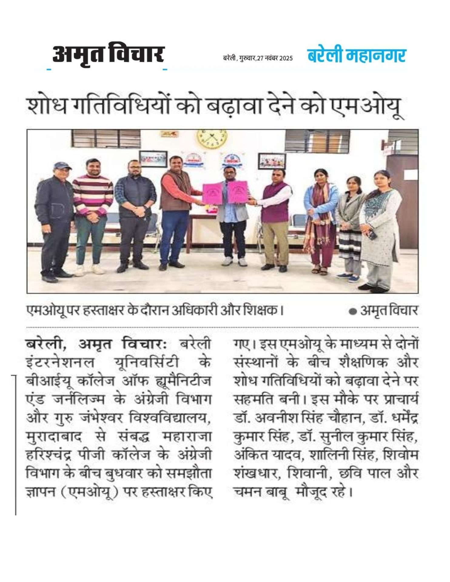 Bareilly, Nov 26, 2025. In a significant step toward academic collaboration, the Department of English, BIU College of Humanities & Journalism, Bareilly International University, Bareilly, signed a Memorandum of Understanding (MoU) yesterday with the Department of English, Maharaja Harishchandra PG College, Guru Jambheshwar University, Moradabad.