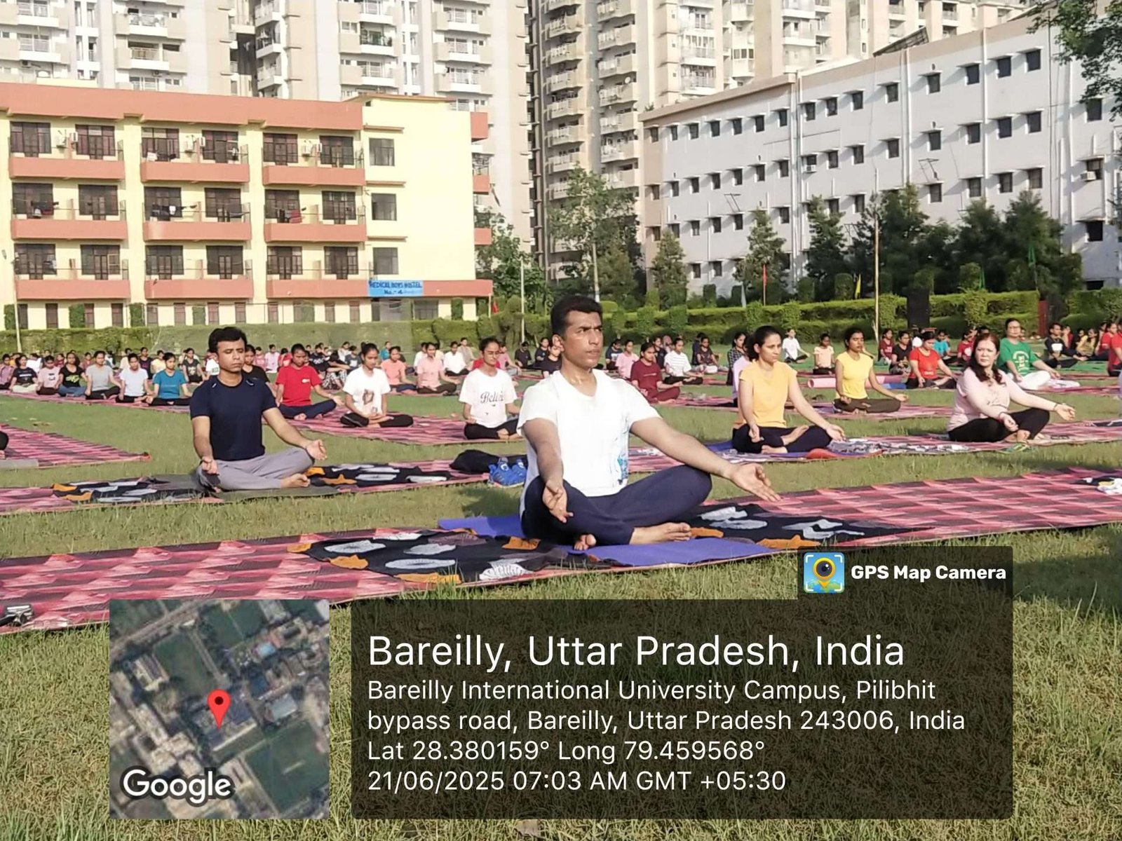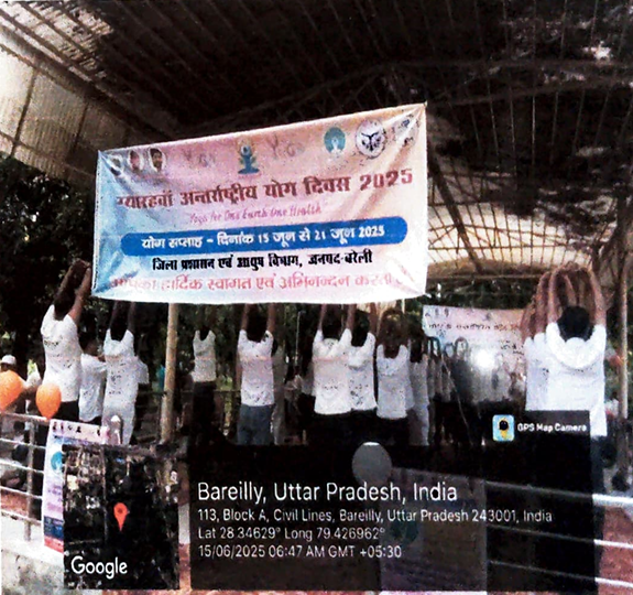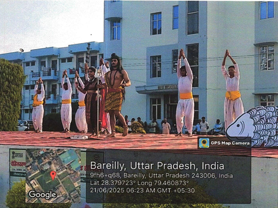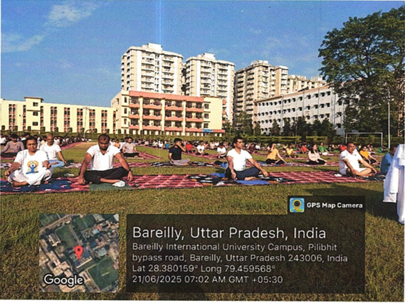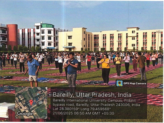 International Yoga Day was celebrated at Bareilly International University, Bareilly (U.P), on 21 June,2025, at Jhanda Ground. The Program commenced with a Yoga-themed Dance performance by the students of Medical, Dental, Nursing, Pharmacy and Paramedical College followed by a yoga session conducted under the supervision of Pro-Chancellor, Bareilly International University, Bareilly Dr. Ashok Kumar Agarwal. The Session conducted with a prayer recitation and certificate distribution.